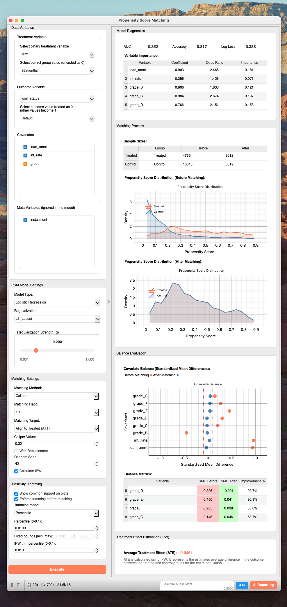 Regression analysis comes with p-values, CI, VIF, and QQ plots, PSM includes balance diagnostics and love plots, and so on.